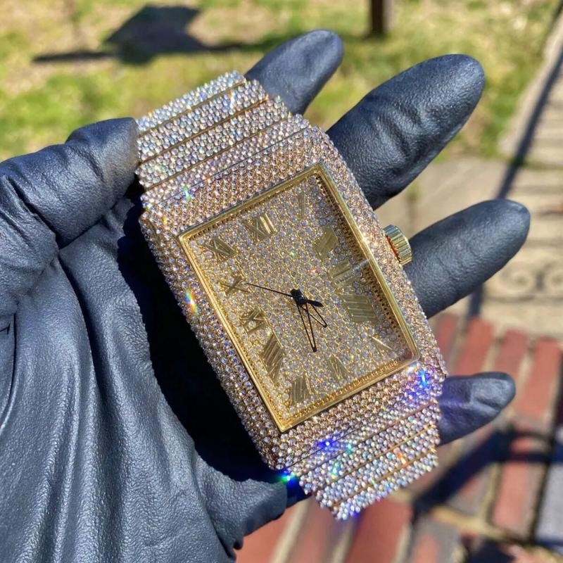 Fully Iced Bling Out Silver PT Mens Heavy Rectangle Dial Flashy Hip Hop Analog Watch - Color: Gold