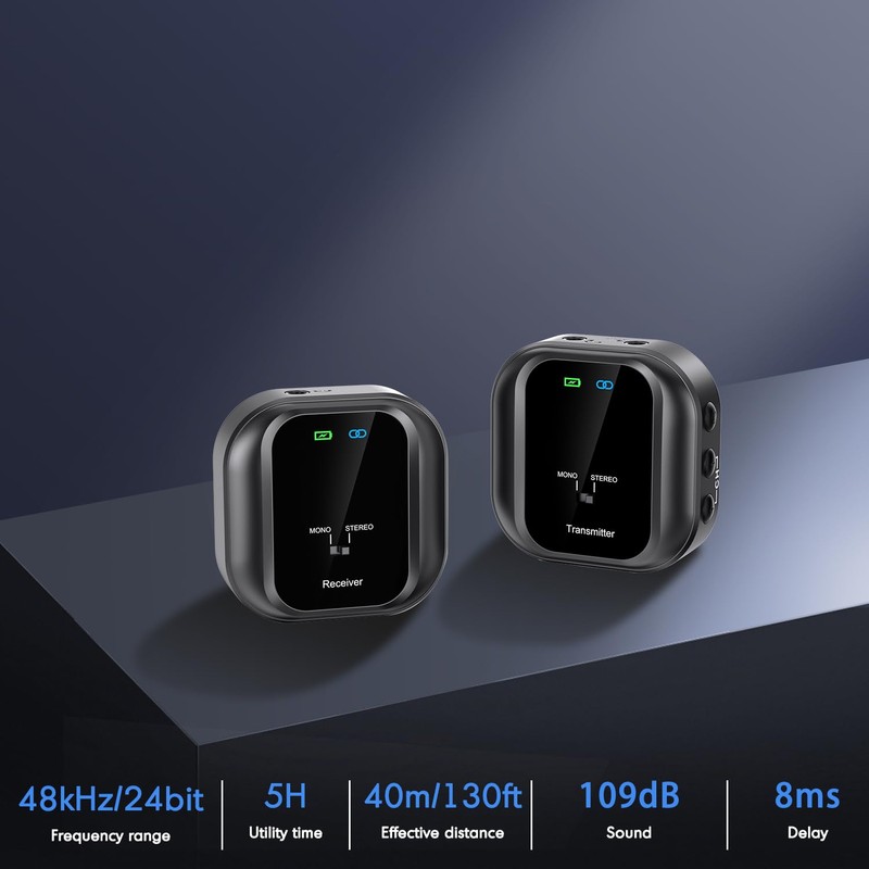 - 【Auto-Pairing】Just turn on the wireless transmitter and receiver, they pair automatically and the blinking blue lights turns into solid. You can also long press the pair button to pair in complex environment. Mono and stereo can be switched to suit different devices.