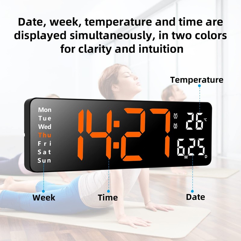 - Digital Wall Clock Large Display: The LED wall clock has a 13 inch display and displays the time, date, day of the week and temperature at the same time