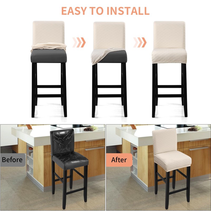 - Easy to install and suitable: just slip on. Short bar stool cover fit for back height: 33-41cm (13-16 inches); Back width: 35-43cm (14-17 inches); Seat length: 35-43cm (14-17 inches); Seat width: 35-43cm (14-17 inches). Please measure the size of your bar stool before purchasing.
