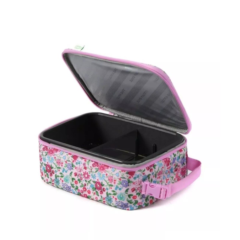 This is a Fulton Bag Co. lunch bag in a Blooming Flowers pattern. It has 2 compartments, a handle lid, and a modern style. Made of polyester, it measures 11 inches in height and 8 inches in width. Designed for kids, this lunch bag features a floral theme and is brand new.