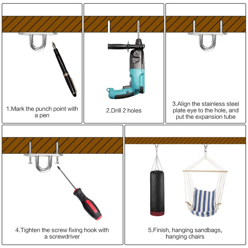 - Wide range of applications: the mounting hook kit is suitable for many occasions, such as: sun sails, pendants, wire ropes, parasols, deck ropes, yoga swings, gondolas, hammocks, flower pots and so on. This is a versatile tool for corrosion resistance both indoors and outdoors.