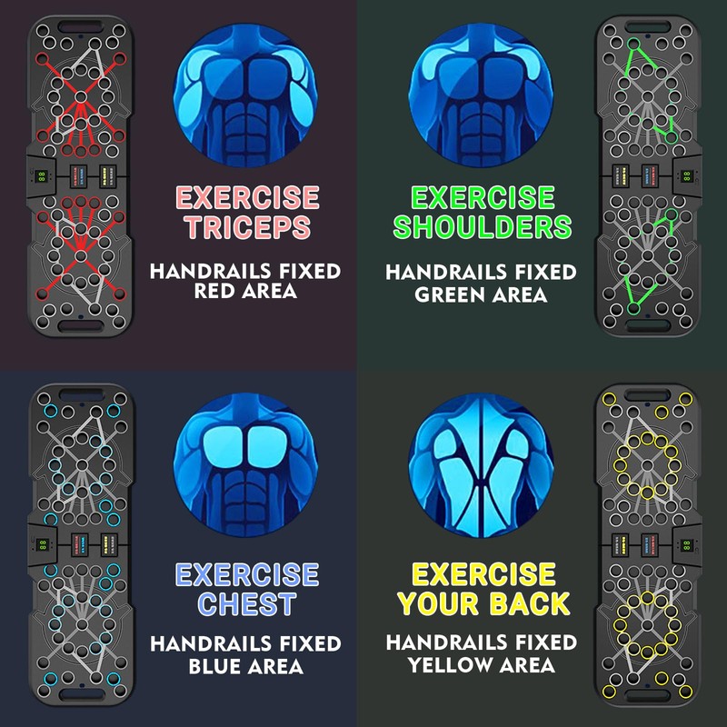 - 【Four major areas, precise training of different muscle groups】Four major areas, 41 push up methods, all-round help you scientifically and accurately train, is a good helper for muscle gain. The blue area trains your chest muscles, the red area trains your shoulders, the yellow area trains your back, and the green area trains your triceps.