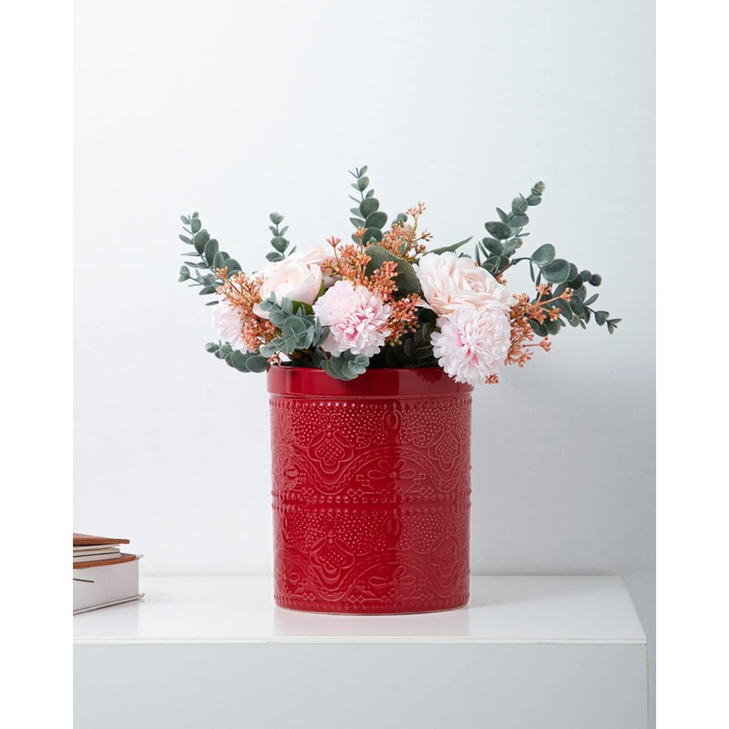 FUN ELEMENTS Kitchen Utensil Holder, 7.2" Super Large Utensil Crock Heavy and Stable Lace Emboss Ceramic Utensil Holder for Kitchen Counter (Christmas Red)