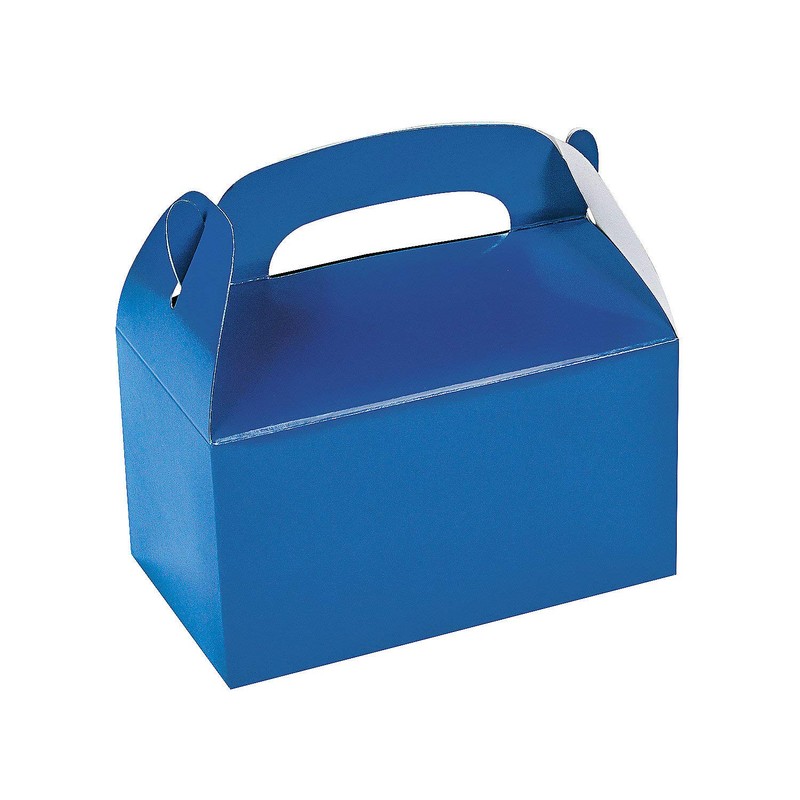 - These Blue Treat Boxes are a must for gifts and goodies on the go. Tote your treats in style or add a little DIY flair and fill these versatile treat boxes with party favors. These Blue Treat Boxes come with handles for easy carrying. Leave them on your birthday party table for guests to grab on the way out. Paper. 6 1/4" x 3 1/2" x 6" Simple assembly required.