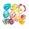 - These pre-filled eggs make setup for an Easter egg hunt an easy task. Assorted. Material: Plastic. (96 pcs./unit) Size: 2 1/4" Each egg is filled with one toy and one sticker.