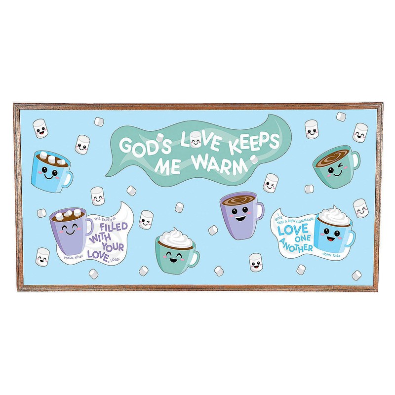 • Featuring smiling mugs and marshmallows with text that reads “God’s Love Keeps Me Warm” this makes for a wonderful addition to Sunday School classroom décor during the winter months