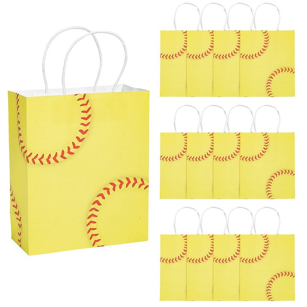 - Hit gift wrapping out of the park with these cute gift bags! Featuring a bright yellow softball design with convenient handles, these bags are perfect for a softball-themed birthday party. You can use them for giving away tournament or end of season gifts, too! Simply fill them with fun party favors and tasty candy from this website. Size: 7 1/2" x 3 1/2" x 9" Quantity: 12 Material: Paper