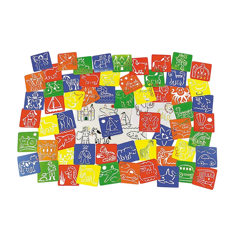 - Packed with mega value our plastic stencil kit includes 12 zoo animals 12 farm animals 12 sea animals 12 transportation and 12 fairy tale fantasy stencils