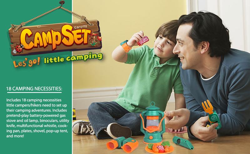 Indoor & Outdoor Activities This camping pretend play set is the best toy for the little campers who love to explore outdoor adventure!It includes all the necessary tools for campers and hikers, such as gas stove, lantern, binocular, utility tool, multifunctional whistle, cooking pan, plates, pop-up tent and sure to keep your little ones busy and entertained for hours of exploring nature fun!