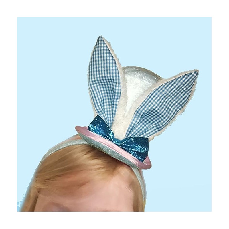Blue bunny ears with top hat Comes on a headband Glitter bow to the front One Size