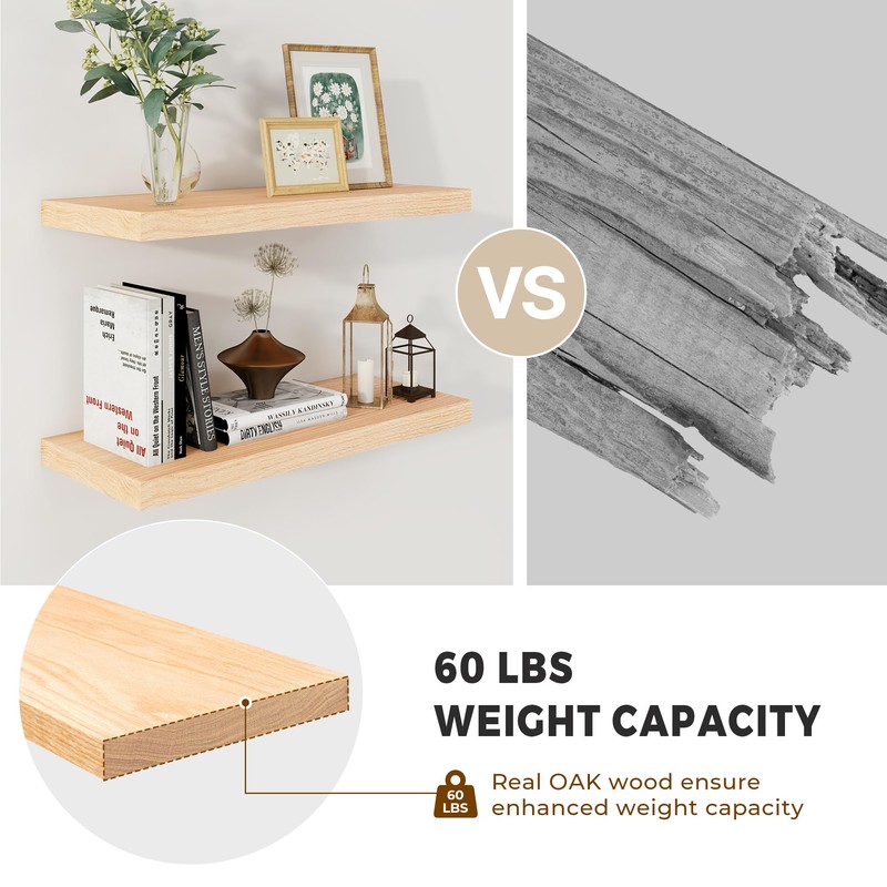- 100% Solid OAK Wood Shelves - These solid oak wood floating shelves are hand selected, sanded, and finished multiple times over to bring out the impressive natural beauty of the wood. These make excellent rustic floating shelves for bedroom walls, bathroom wooden shelves, or simply to elevate your interior design aesthetic.