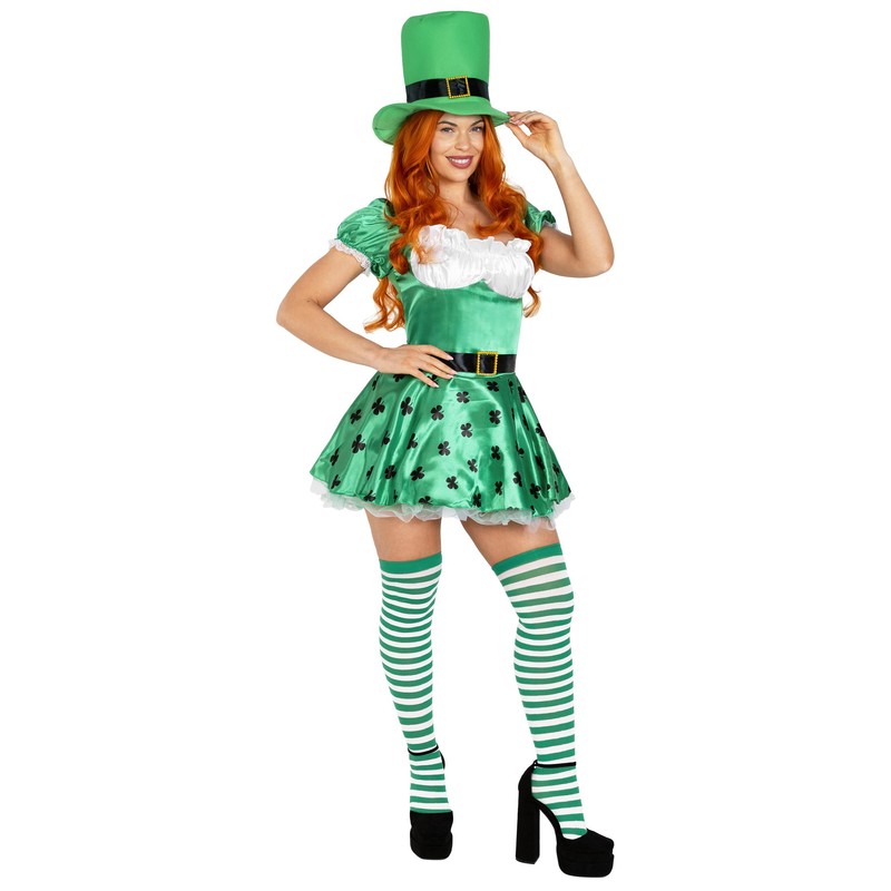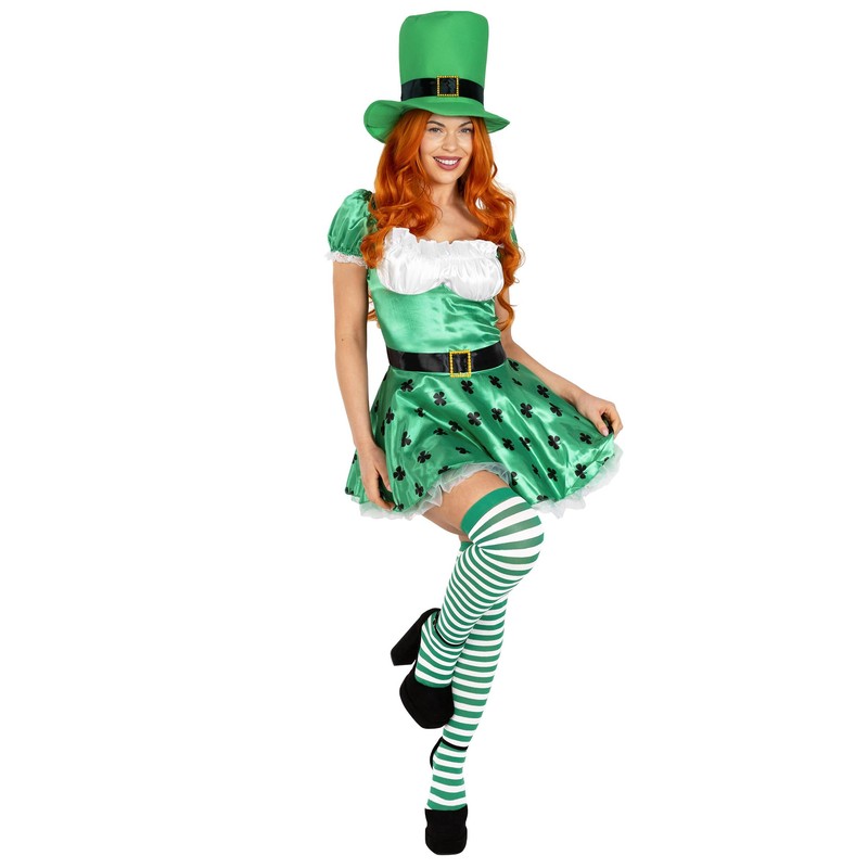 - Leprechaun fancy dress includes a green clover-print dress, striped knee-high socks and a large green top hat.