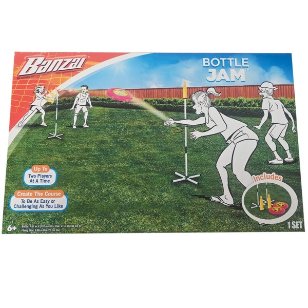 Bottle Jam Flying Disc game. This flying disc game is fun for family, adults and kids. Take and play anywhere! Bottle Jam can be set up and ready to play in minutes. Great for backyard, beach, camping and even tailgating parties. Teams of 2 players take turns trying to knock the bottle off the other team's pole with the flying disc to score points. The throwing team earns points if the opposing team allows the falling bottle or thrown disc to hits the ground. First team to earn 21 points wins