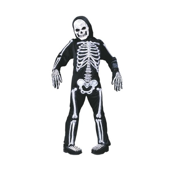 Great skeleton costume with sculpted bones attached! Includes a black velcro- back jumpsuit, gloves, shoe covers, and mask with attached hood. 100% polyester, bones are 100% EVA. Care instructions: Hand wash separately in cold water, line dry. Do not bleach or iron.