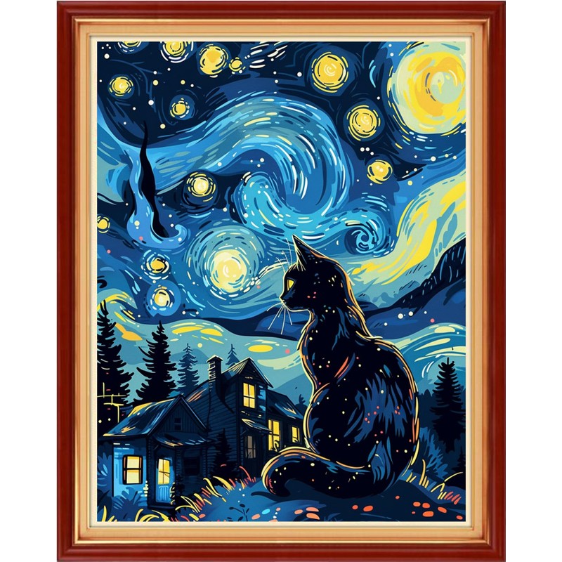 Funart Stamped Cross Stitch Kits for Beginners Full Range of Cross Stitching Preprinted Embroidery Kits for Adults, 11CT Embroidery Pattern Needlepoint Kits-Van Gogh Starry Cat 16x20 inchs