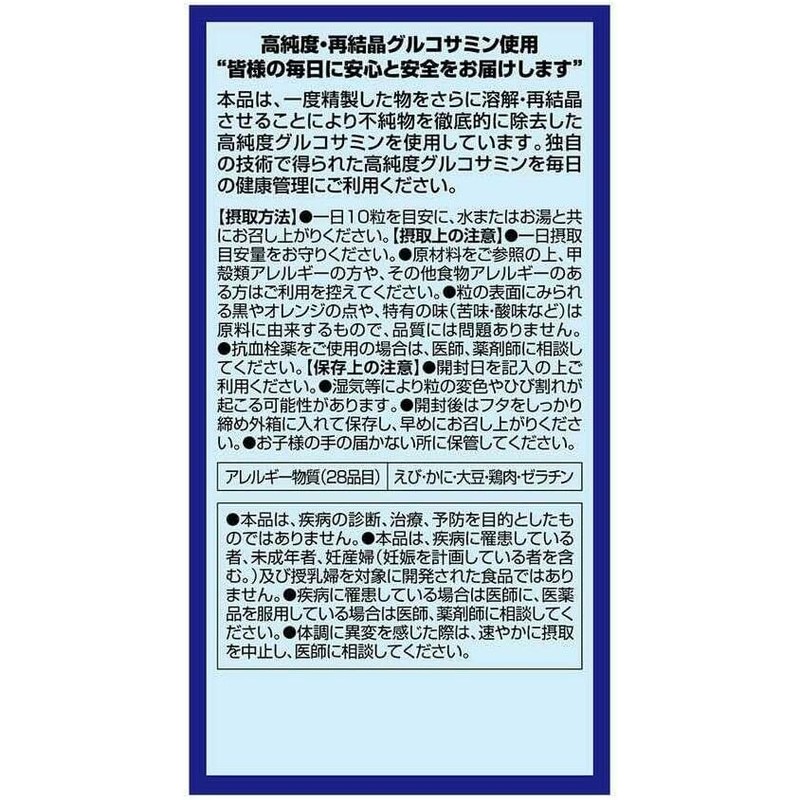 glucosamine 1500mg, mucopolysaccharide protein complex (contains chondroitin) 100mg, fermented collagen hydrolysate 100mg, soybean germ extract 6mg (soy isoflavone aglycone 1.6mg), low molecular weight hyaluronic acid 1mg, chicken cartilage extract 10mg (contains type II collagen)