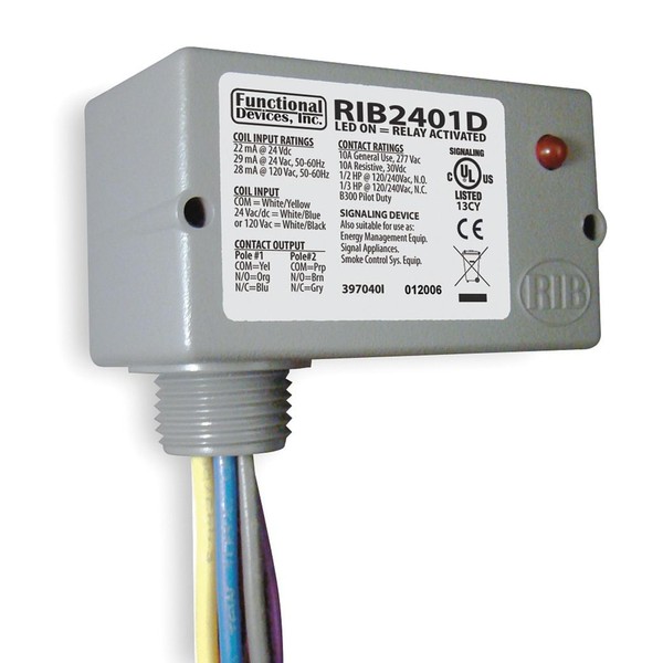 FUNCTIONAL DEVICES RIB RIB2401D 10 AMP DPDT, 24 VAC/DC/120 VAC Coil, -30 to 140 F, 600 Volt Wire Rating, NEMA 1 HOUSING, Pilot Relay