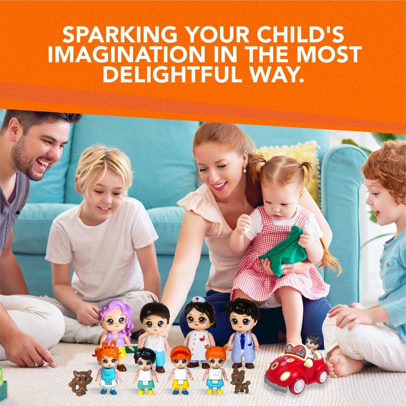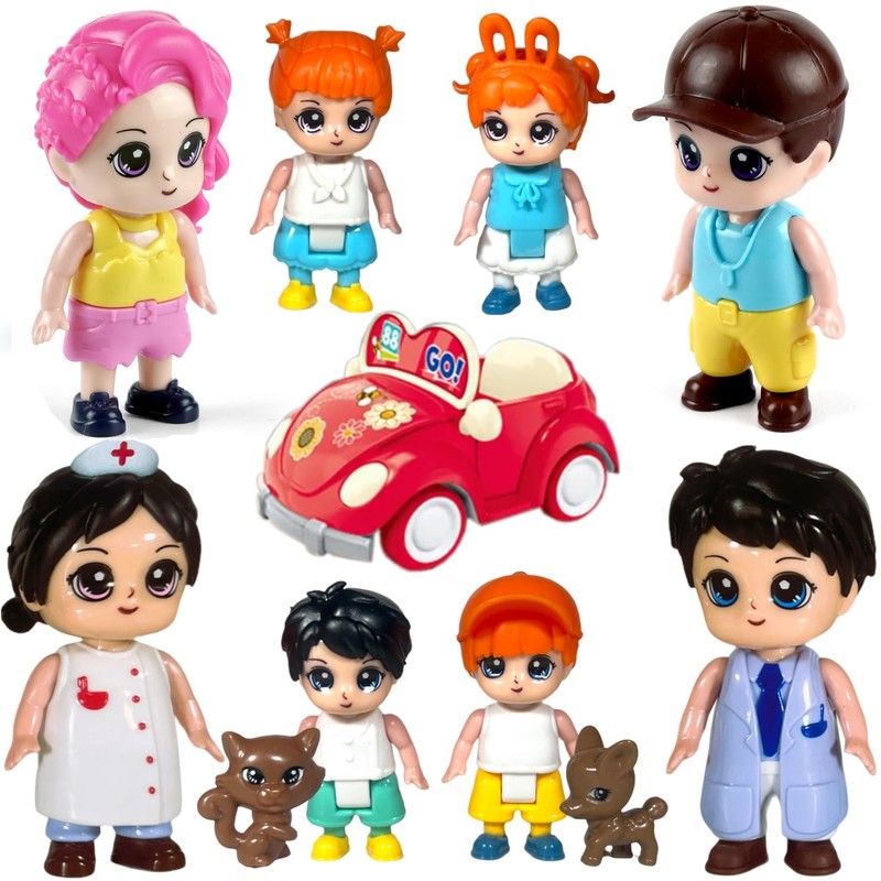 - MEET THE ADORABLE FAMILY: This doll set is full of fun and color. Featuring eight dollhouse people: a dad, a mom, and four boys & girls little people figures. They also have a cat, a dog, and a car.