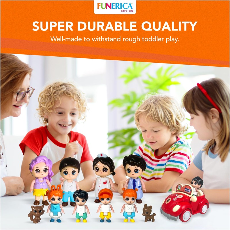 FUNERICA Doll House People Figures Playset - Adorable Dollhouse Family with Parents, Siblings, Doctor, Nurse, Pets & Car - Cute Little People Dollhouse Accessories Set