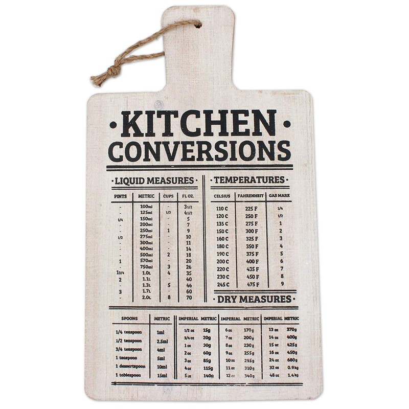 - Keep this Kitchen Conversion Wall Plaque at all times for easy access to converting cups, tablespoons, pints and quarts. Hang it in the kitchen and sneak a peak when needed
