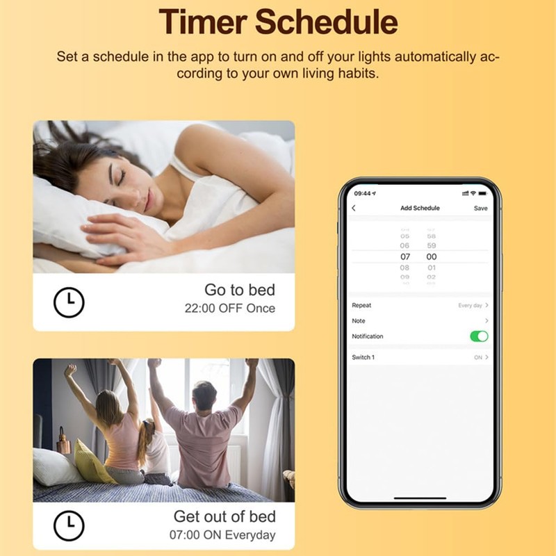 - 📍Timer Schedule: Set a schedule in the app to turn on and off your lights automatically according to your own living habits.