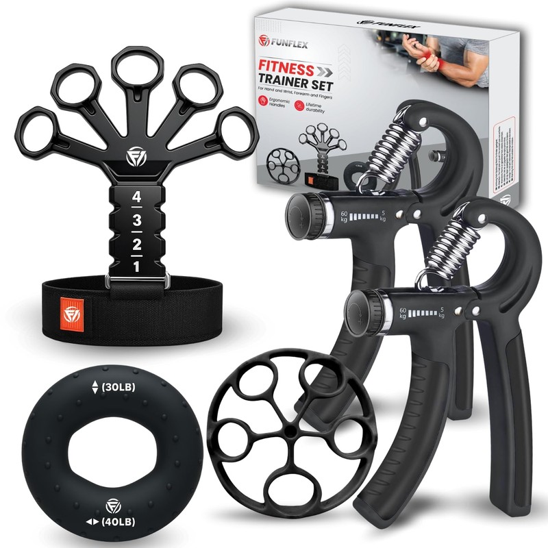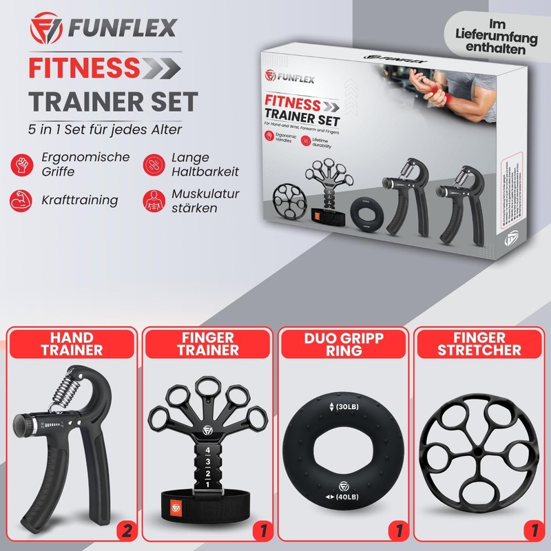 FUNFLEX Hand Trainer, Finger Trainer, Adjustable Grip Strength Trainer Set, 5 Pieces, Forearm Trainer, Finger Stretcher, Wrist Band, Finger Grip Trainer, Grip Ring, Hand & Forearm Training