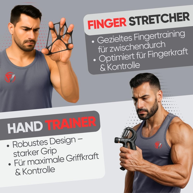 - Comprehensive training set: This 5-piece set offers everything for effective forearm strength training. Included are an adjustable hand trainer (5 - 60 kg), a finger trainer band with 4 resistance levels, a finger strength trainer for fine motor skills, as well as a hand grip trainer ring for targeted forearm strength training at home.