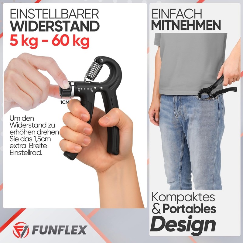 - (Adjustable resistance) - The resistance of the hand gripper can be adjusted between 5 kg - 60 kg. Adjust the resistance to your force level. Improve your finger and wrist flexibility with the hand strength trainer.