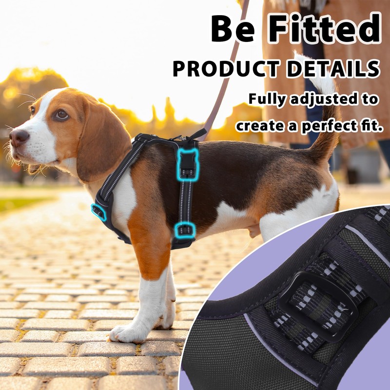- NIGHT PROTECTION: Our dog harness has a reflective strip design. You can see your dog is pretty clear with faint light at night. Don't worry about it getting lost or any accidents happening. And have a nice night walking with dogs.