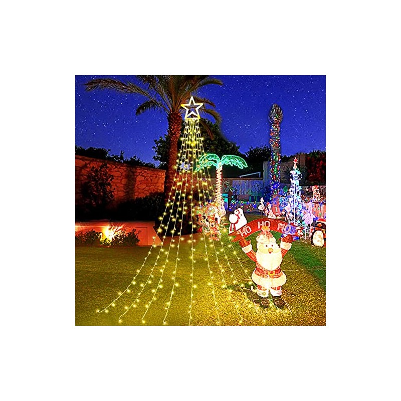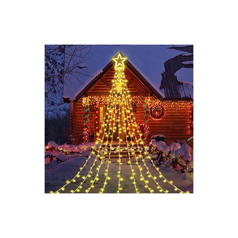 **FuNiao Outdoor Christmas Decorations Star String Lights, Waterfall Christmas Tree Lights 317 LED 8 Lighting Modes & Timer Christmas Star Lights for Outside Tree Wall Yard Christmas Wedding Party Decor** **IDEAL CHRISTMAS DECORATIONS OUTDOOR AND INDOOR:** This beautiful outdoor decorations christmas star lights will light up your Christmas and holiday seasons! Christmas Star Lights includes a 16.4ft extension cord, 12.6in topper star, 9 string lights, 11.4in long light strings. **Widely Use to Hanging Christmas Tree Outdoor** 1) You can drape them like they are in the photo, following the tree shape, just like a waterfall; 2) Or hanging them sideways more like a shooting star; 3) You can also use either with a pole (not include) or hang the star on something or cone on the base to attach to trees (comes with 10pcs metal insert for fixing), the topper star has a ring hole on top for hanging. **SPECIFICATIONS:** \- LED Quantity: 317 LED (each strand 32 led, topper star 29 leds) \- Size: star 12.6in, string light length 3.5m/11.5ft, plug lead cable length 5m/16.4ft \- Voltage: 30V safe low voltage (Includes UL plug-in transformer) \- Power source: Plug-in electric \- 8 Lighting Modes \- Timer & Memory Function \- 10pcs Metal Insert \- IP44 Waterproof \- Lights color: Warm White \- Wire Color: Clear wire **Package** 1 x Star String Lights 1 x Adapter 1 x User Manual / Instructions 10 x Metal Insert **NOTE:** **There is NO pole / stand with this product.** **Please kindly protect the power adapter from water!** **SOFT AND BRIGHT LIGHT SOURCE:** Warm white light, light up your garden. The source of light is a row of LED, which disperses light very well and provides powerful yet even light without harsh glare or shadows.