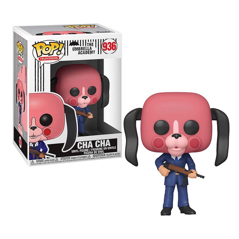 - From umbrella Academy, Cha with mask, as a stylized POP vinyl from Funk!