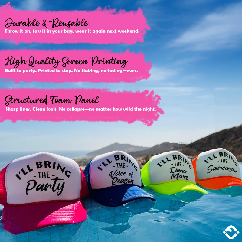 Funky Junque Funny Girls Weekend Trucker Hat for Girls Trip or Bachelorette Party, 'I'll Bring The Party' Cap, White/Hot Pink