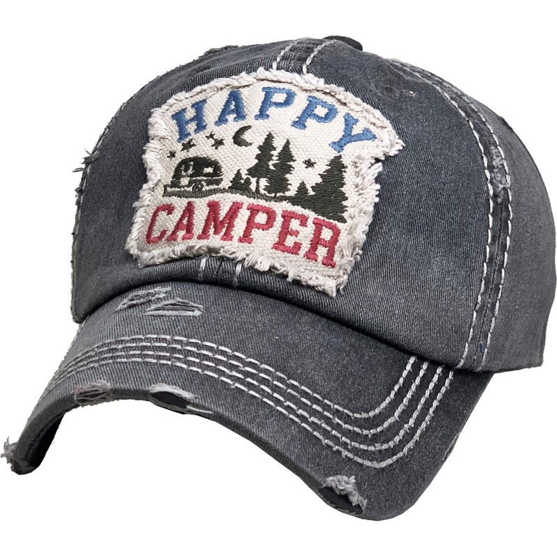Funky Junque Womens Baseball Cap Distressed Vintage Unconstructed Embroidered Patch Hat (Happy Camper W/Trees - Black)