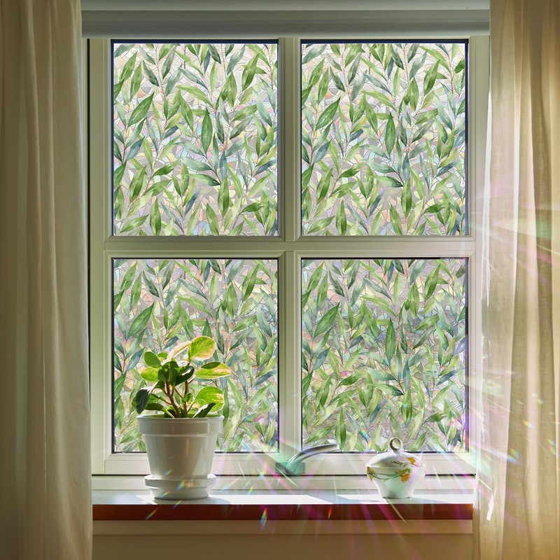 - Reusable double-sided design of the stained glass window film makes the patterns on the film viewable inside and out the window. Window privacy film keeps UV out and heat blocking. Rainbow rays streamed through the window turn transparent glass window/door into fashionable colorful window/door, while allowing some light in