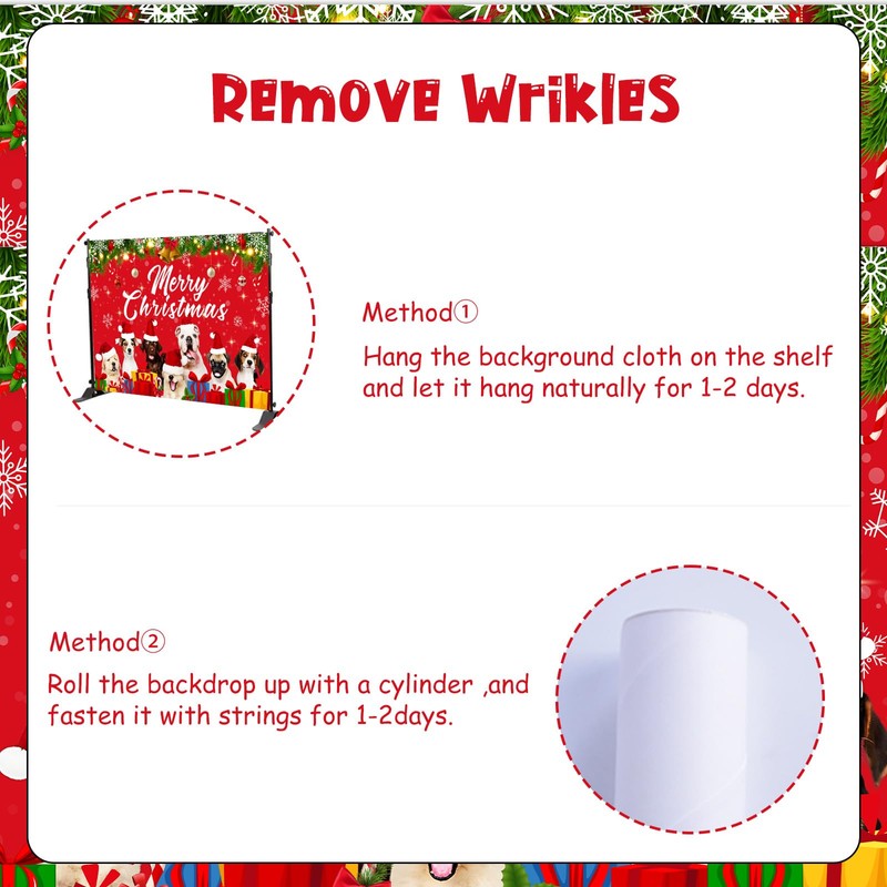 Our Merry Christmas backdrop is made of high quality vinyl and printed with cute Santa dogs, snowflakes, Christmas bells, gifts, “Merry Christmas” beautiful font and other Christmas elements patterns. The dog Christmas photo backdrop can be effortlessly placed anywhere you desire, indoor outdoor or yard, and you can take photos with your friends and family in front of the Christmas dog backdrop, which will make your party full of Christmas festival atmosphereProcessing Time