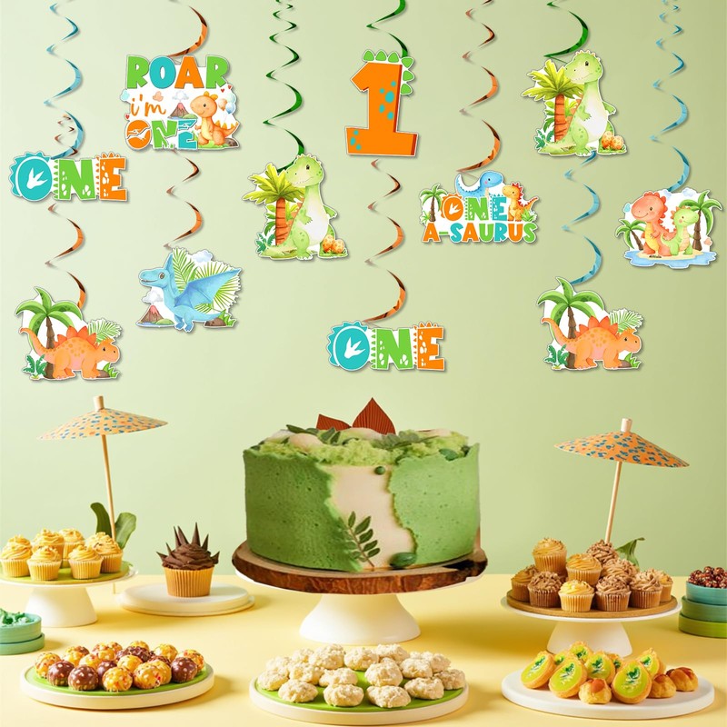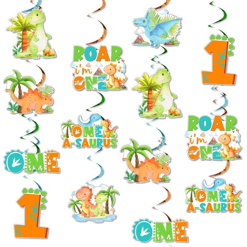 - Dinosaur 1st Birthday Decorations Boy: The green and orange dinosaur hanging swirl decorations are designed for dinosaur 1st birthday party, one a saurus birthday party, roar im 1 party, jungle safari Animal birthday party and so on