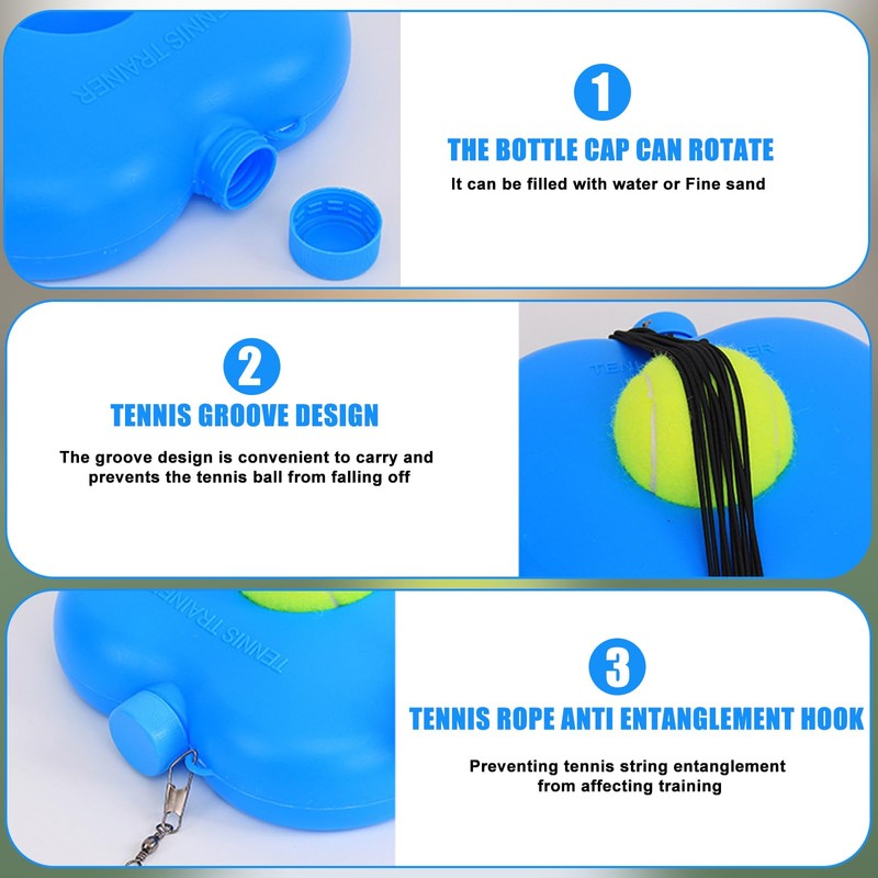- Improved base design: it is wind-resistant and has a non-slip design at the bottom to increase stability. The special inlet and outlet design, by filling the training device with water or sand and subsequent non-slip design on the bottom, the stability of the trainer base is improved. The spherical groove design fits perfectly with the attached tennis ball.