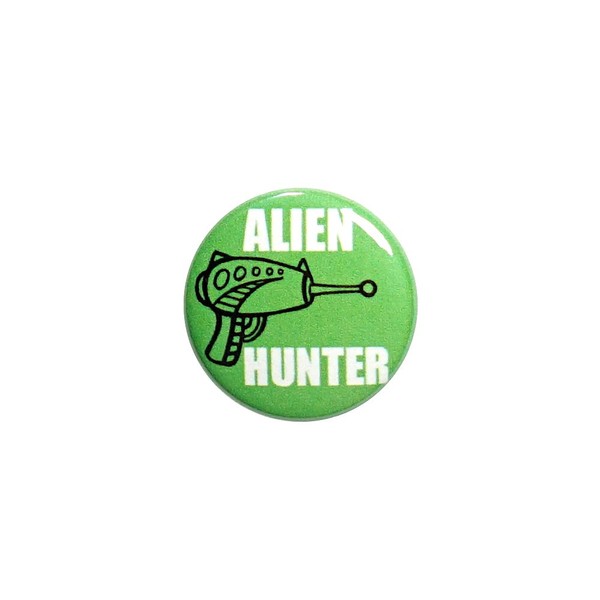 Funny Alien Hunter Button Pin Random Humor Blaster Ray Gun Pinback 1 Inch 66-27