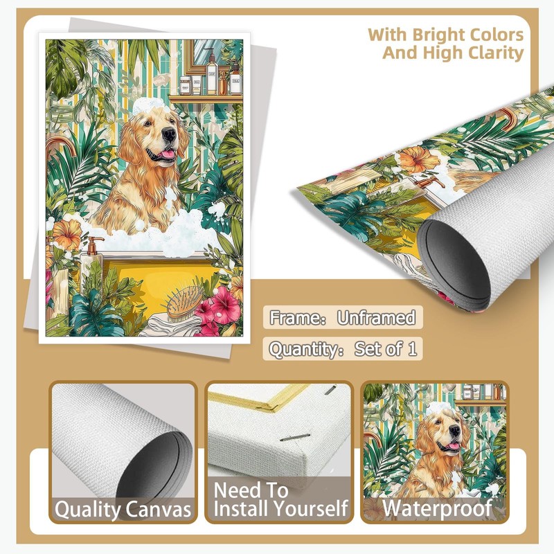 - Captivating Design: Featuring a funny golden retriever enjoying a bath, this canvas poster brings a playful and cheerful vibe to any space, making it an ideal wall decor piece for bathrooms or bedrooms.