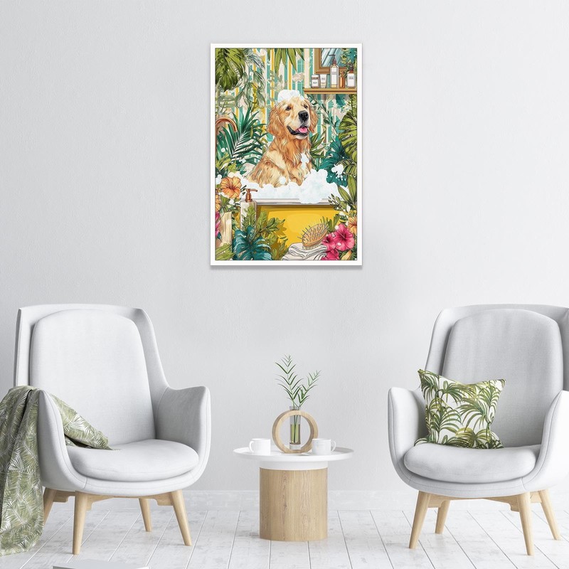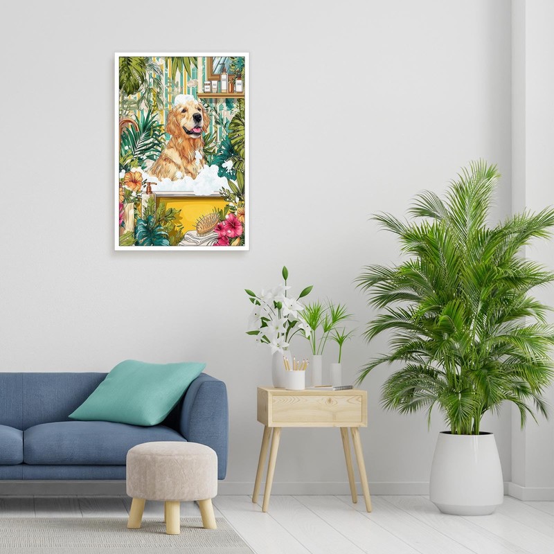 - Captivating Design: Featuring a funny golden retriever enjoying a bath, this canvas poster brings a playful and cheerful vibe to any space, making it an ideal wall decor piece for bathrooms or bedrooms.