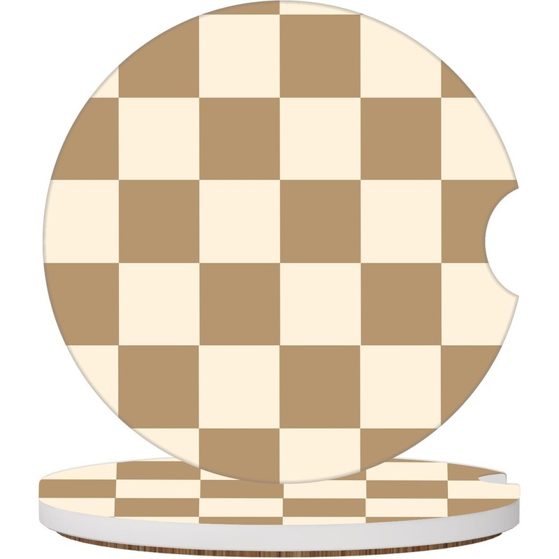 Funny Beige Checkered Car Coasters for Cup Holders, 2 Pack Car Cup Holder Coasters for Women Men, 2.56 inch Anti Slip Insert Absorbent Ceramic Car Cup Coasters with Cork Base and Finger Notch