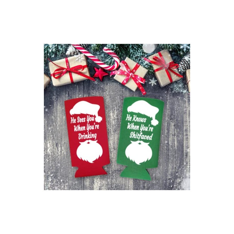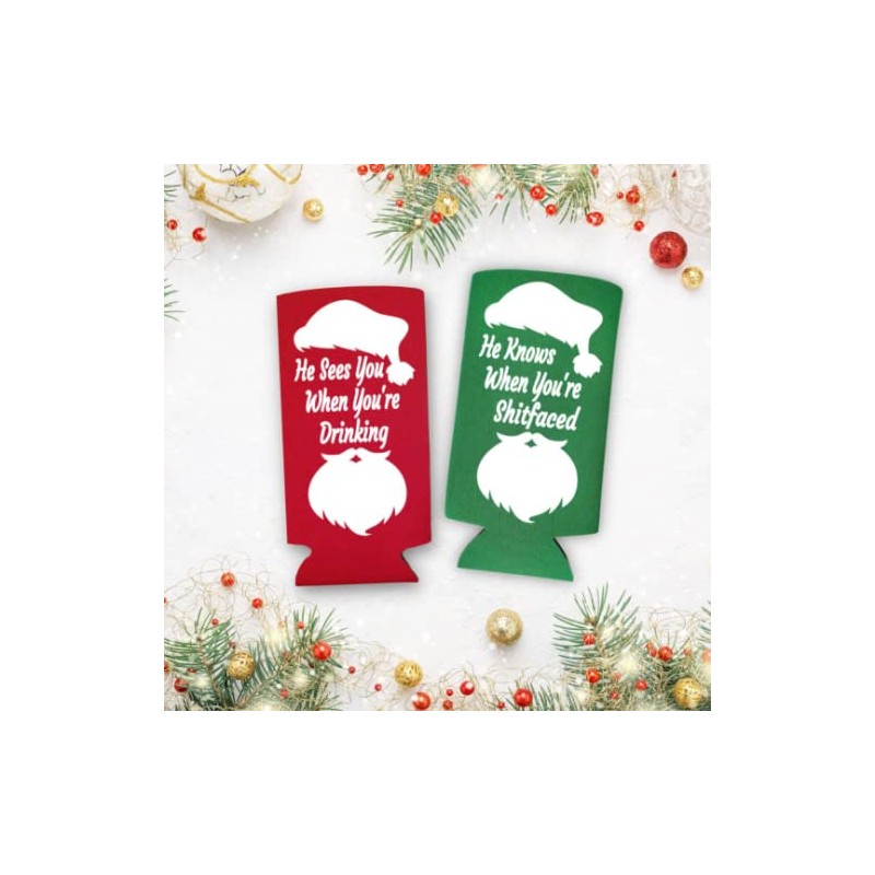 Funny Christmas Party Seltzer Coolies - He Sees You When You're Drinking, He Knows When Your Shitfaced - Spiked Seltzer Holiday Slim Coolie (1 Red 1 Green)