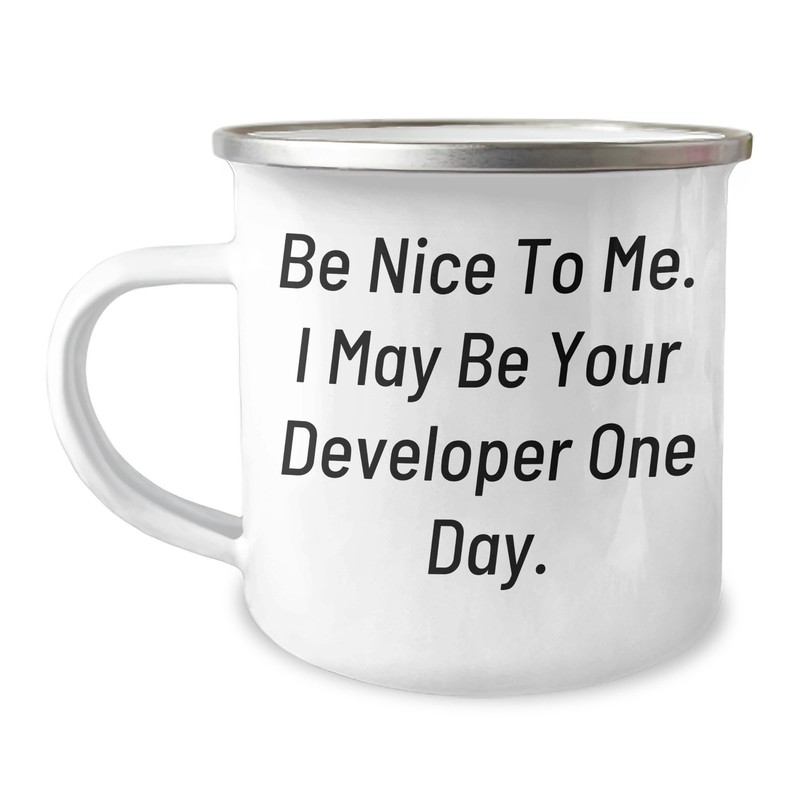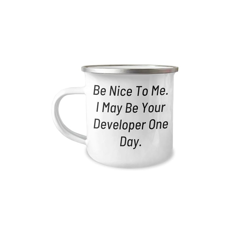 - Surprise your developer friend or family member with this funny and functional 'Be Nice to Me. I May Be Your Developer One Day.' camping mug, a unique gift for any occasion.