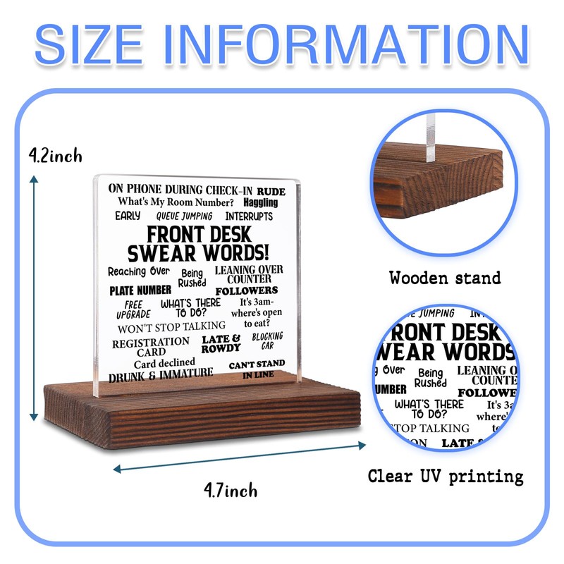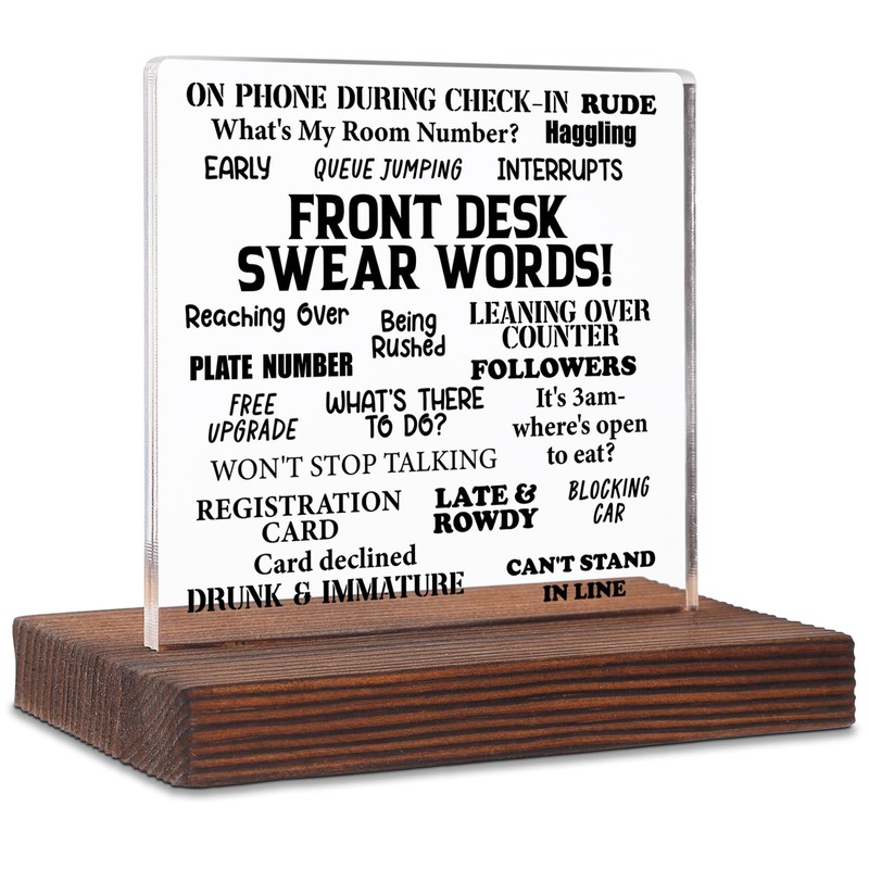 Funny Front Desk Sign for Receptionist Office Decor, Acrylic Desk Plaque with Guest Swear Words, Hilarious Gift for Hospitality Staff, New Job Leaving Retirement Gift Idea SKT250
