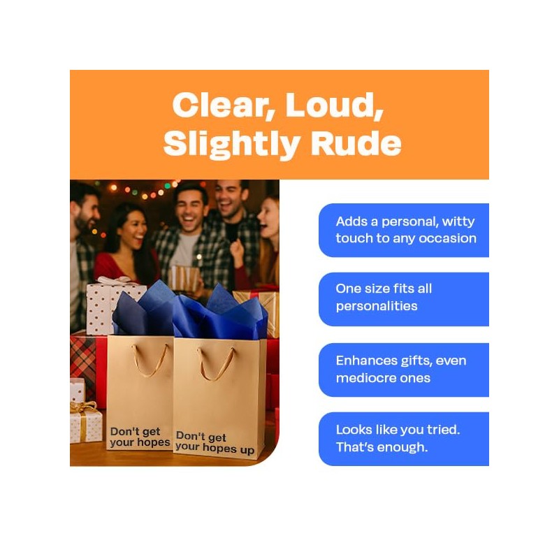 - πππππ-πππ-ππππ ππππππ: Features the witty phrase 'Don't Get Your Hopes Up' boldly printed on the front. This funny message is a great conversation starter, delighting procrastinators and recipients alike. It adds character to your gift, making the wrapping as entertaining as the present itself.