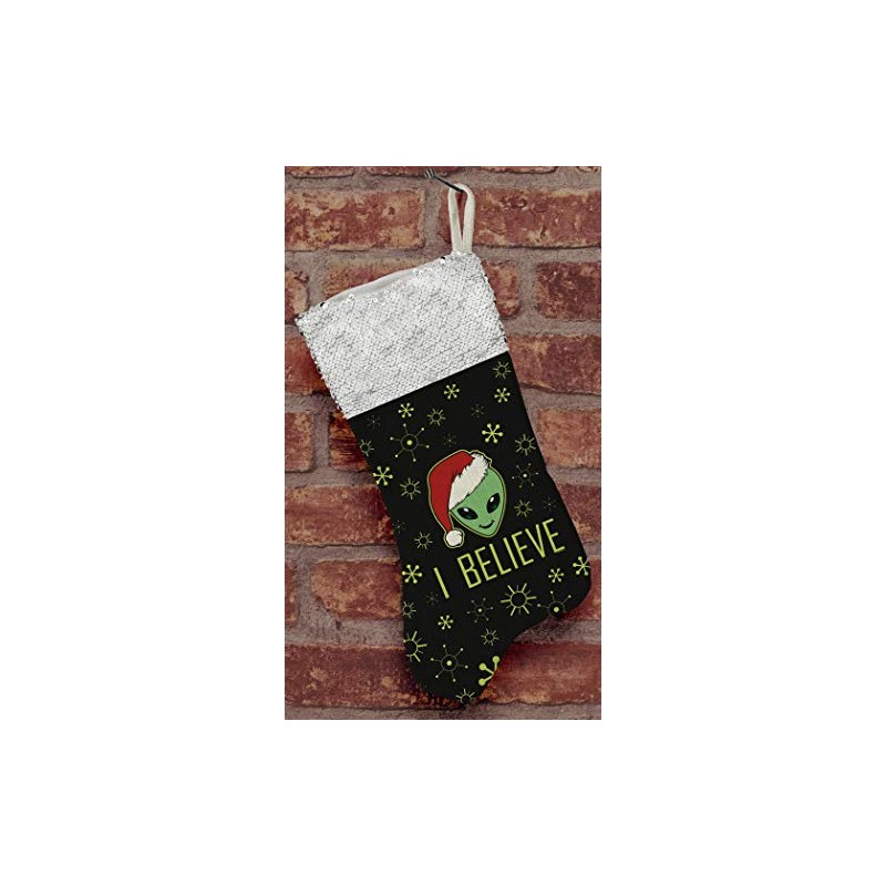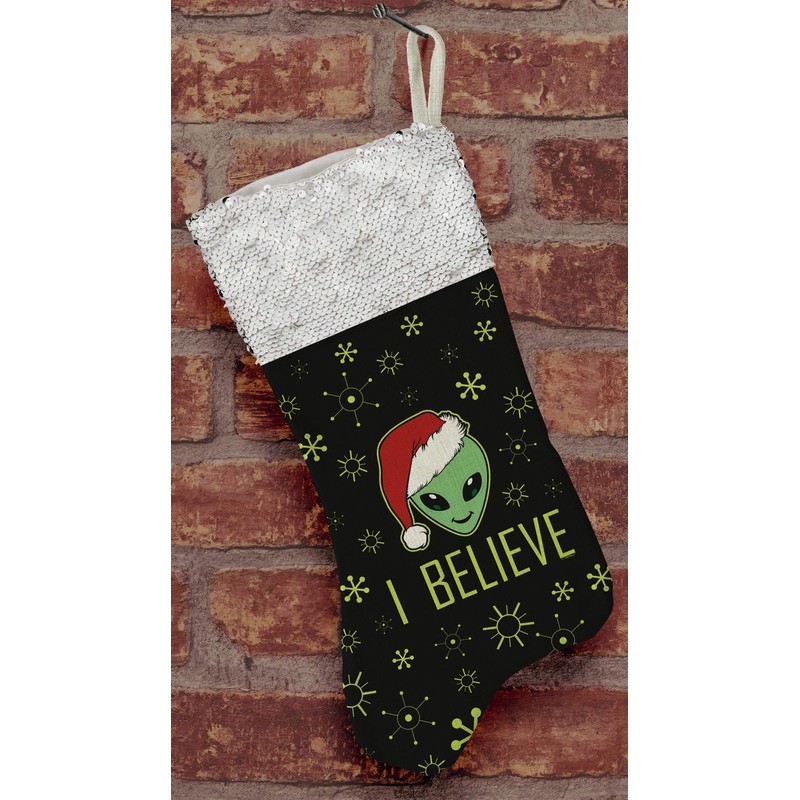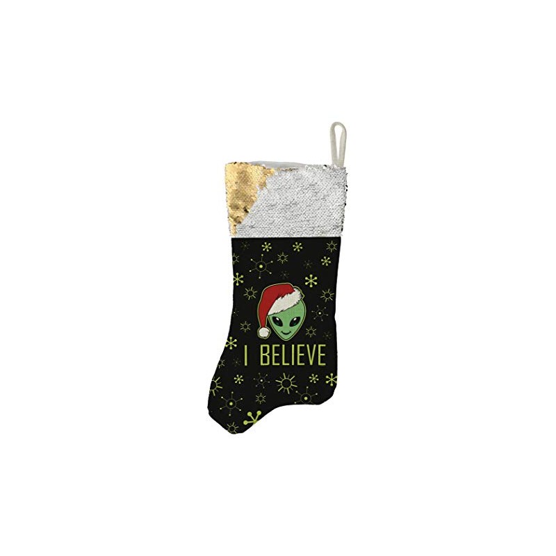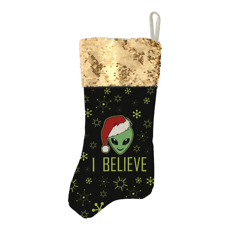 Funny Holiday Decor Christmas UFO Alien I Believe Flip Sequin Stocking Gold