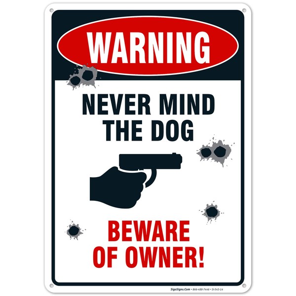 - FUNNY NO TRESPASSING SIGN - Never Mind The Dog Beware of Owner Sign, 10x14 Rust Free Heavy 0.40 Aluminum, UV Protected, Long Lasting Weather/Fade Resistant, Easy Mounting, Indoor/Outdoor Use!