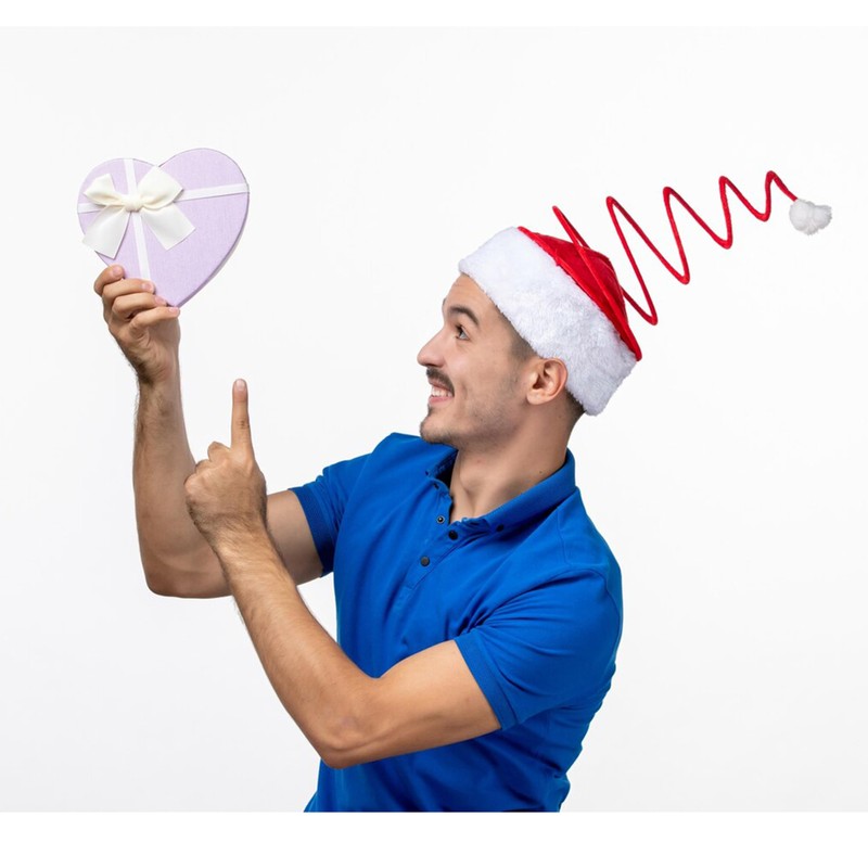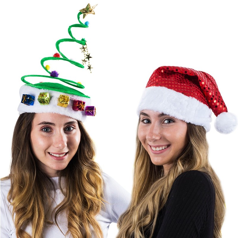 - Este juego viene con sombreros de Papá Noel de felpa roja, un sombrero de Papá Noel de lentejuelas, así como sombreros de árbol de bobina elástica.