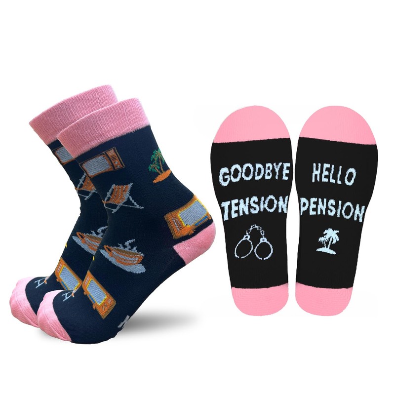 - 🎉【FUNNY RETIREMENT SOCKS – THE PERFECT GIFT FOR RETIREES】"GOODBYE TENSION,HELLO PENSION" – These fun and humorous retirement socks are an ideal gift for anyone entering retirement. Perfect for retirement parties, they bring laughter and comfort to this special milestone